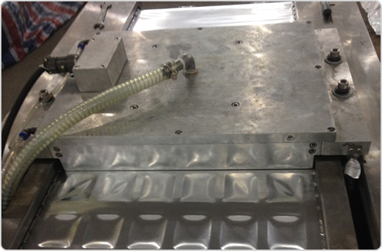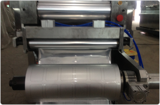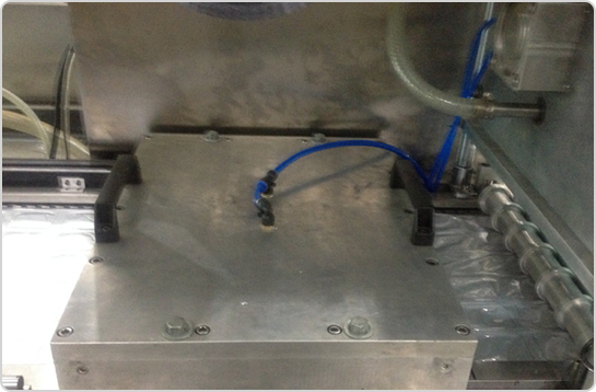 4、設(shè)備中部(封口和真空區(qū)域) 由封口模具和上加熱模具,設(shè)備通過(guò)步進(jìn)到達(dá)封口真空區(qū)域,下膜模具通過(guò)氣缸上升、壓緊上加熱模具,再通過(guò)真空管路進(jìn)行抽真空,最后完成封口。 |