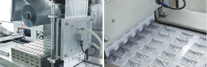 4、設(shè)備中部(封口和真空區(qū)域) 由封口模具和上加熱模具,設(shè)備通過(guò)步進(jìn)到達(dá)封口真空區(qū)域,下膜模具通過(guò)氣缸上升、壓緊上加熱模具,再通過(guò)真空管路進(jìn)行抽真空,最后完成封口。 |
